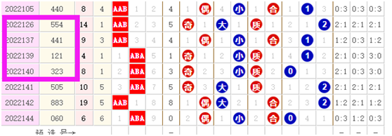 此时大家注意方框内的组三数据,我们可以看到126期开奖554, 137期开奖441,大家应该可以看到组三落号码了,虽然两期间隔了12期,但是组三是落号码,落的是号码4,从137期到139期组三也落号码,此时落的是号码1, 139期到140期组三落号码,落的号码是2,这点就证明组三落号模式很常见,但是,从141期开始开出组三,一直到144期连续3期开出组三都没有落号码,这个时候我们就要有一个思路。
