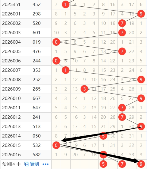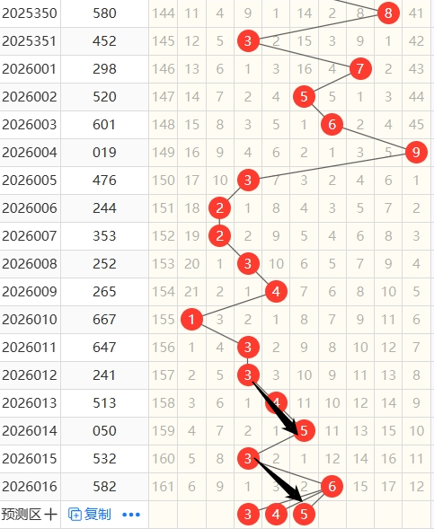 上期跨度为6,近5期跨度开出情况:第26011期开出3,属于奇数,0路号码,木属性;第26012期开出3,属于奇数,0路号码,木属性;第26013期开出4,属于偶数,1路号码,金属性;第26014期开出5,属于奇数,2路号码,土属性;第26016期开出6,属于偶数,0路号码,水属性;