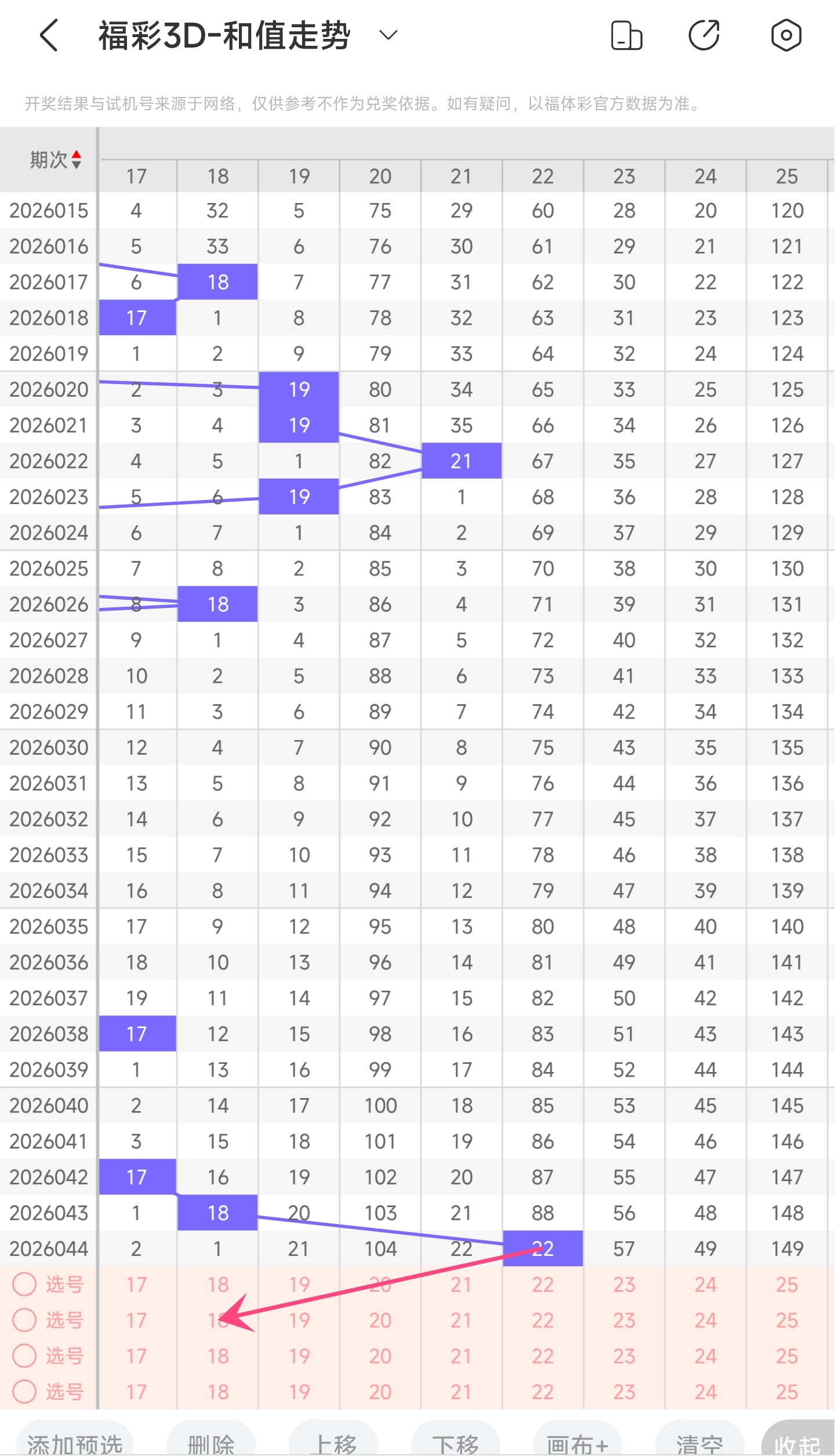 上期和值是22,往前一期和值是18。和值往右移动,偏移振幅为4。22和值是处于近30期内开出最大的和值。下降的空间比较大,上升的空间很小,本期比较看好和值变小,所以推测本期趋势是大概率变往左,和值变小,小概率往右,和值变大。
