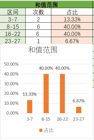 上期和值是8,处在8~15之间,各个类型占比没有变化。目前是16~22,8~15占比最优,然后是3~7,最后是23~27。本期看好和值在8~15之间,其次是16~22。