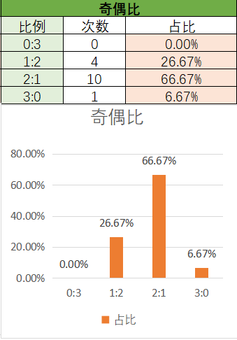 上期奇偶比为2:1,其中2:1占比变大,1:2占比变小。近15期内2:1优势最好,然后是1:2。上期开了2:1奇偶比,本期还是看好2:1奇偶比的开出,其次是1:2。