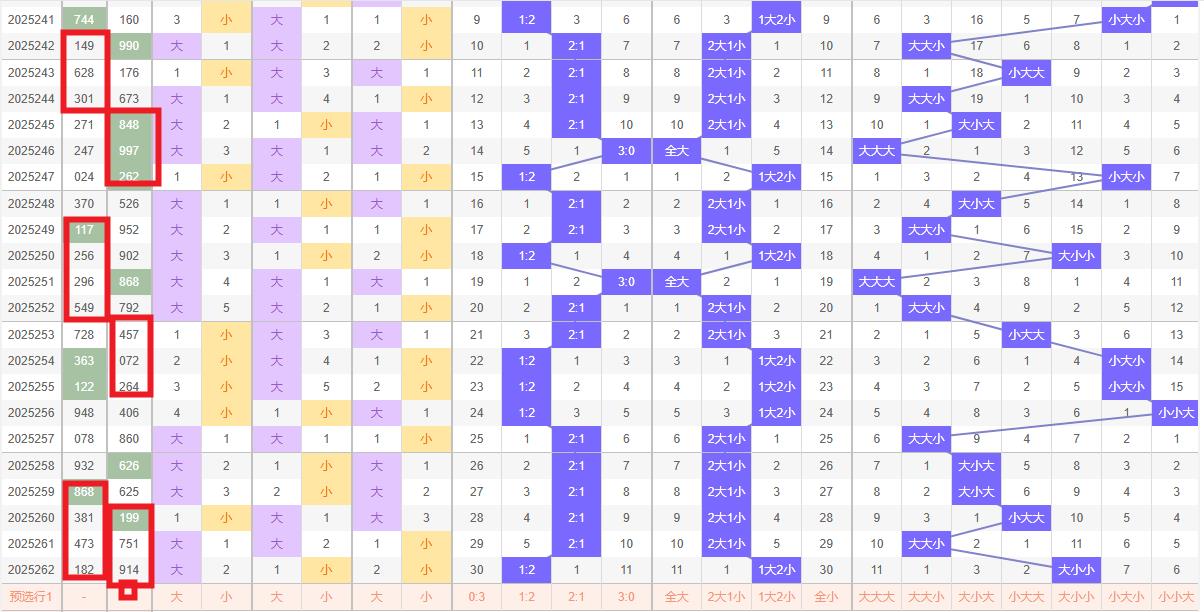 大小走势分析: 在福彩3D的大小走势中,近期数据显示大小组合分布较为均衡,但细致观察历史数据,发现大小组合呈现出一定的周期性变化。对于第263期预测大小比例可能为1:2或2:1。考虑到近期小号略有增多,建议重点关注大小比例为1:2的组合,即两个小号搭配一个大号,防全小。