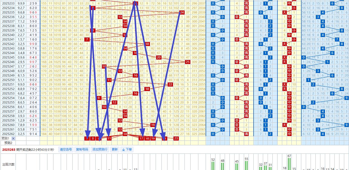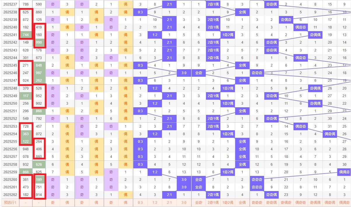 奇偶比例预判 在奇偶比例方面,第262期开出了914奇奇偶的组合,显示出奇数号码的强势。然而,根据奇偶比例的自然平衡原理,偶数号码在第263期有望得到更多的关注。因此,263期的奇偶比例可能为1:2,即偶数号码占据多数。这种预判基于对历史数据的深入分析,以及对奇偶比例波动规律的把握。奇偶比例为1:2.