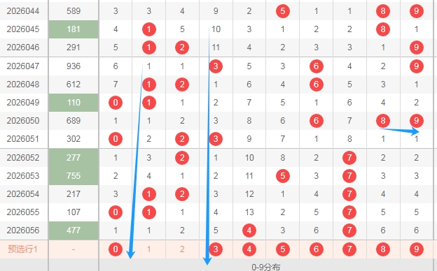 上图是福彩3D开奖号码走势分布图,我在上面走势图中标注出来的数字都是合数数字04689,标注出来的蓝色小箭头表示质数数字,上期又开出两个质数数字一个合数数字,最近开出的质数数字太多了,那么本期合数数字04689至少可以关注出一个或者两个,可以防出3个。