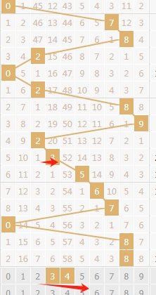 上图是福彩3D开奖号码和值尾数走势分布图,我在上面走势图中标注出来的是3尾数和4尾数,3尾数和值遗漏了6期上次遗漏了20期,4尾数和值遗漏了58期,那么本期或者近期大家留意这两个尾数和值吧。