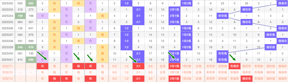 (二)、奇偶分析 奇数 13579 偶数 02468 在这5期 数据中 奇数出现7次 偶数出现 8次 从昨天出号来看偶数占优, 本期还是看好奇数有号 看好 偶偶奇 奇偶奇