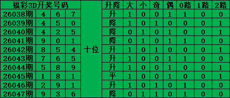 福彩3D是从0-9每期开出3个号码,截至2026047期三个位置最大遗漏的是40期的:百位的3号。
