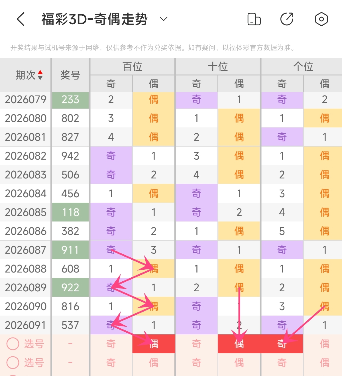 上期奇偶形态为奇奇奇,奇偶比3:0,奇数号码占优,全奇组合。根据近期奇偶形态变化来看,上期奇偶形态开出为全奇组合较为极端,本期需注意偶数号码的反弹,预计本期奇偶形态会回补偶数号码占优组合。预计本期奇偶形态可关注奇偶比1:2,偶数占优组合 。本期奇偶形态可重点关注:偶偶奇。