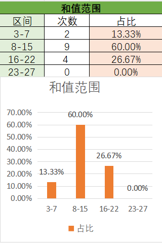 上期和值是19,处在16~22之间,各个类型占比没有变化。目前是8~15占比最优,次之是16~22,然后是3~7,最后是23~27。本期看好和值在8~15之间,其次是16~22。
