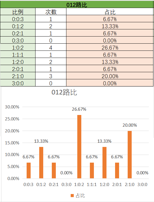 上期大小比为3:0,各个类型占比没有变化。可以看到近15期内1:2优势最好的,其次是2:1,最后是3:0,0:3。本期看好2:1开出,其次是1:2。