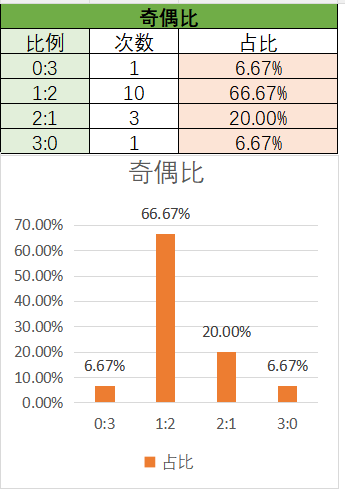 上期奇偶比为1:2,1:2占比变大,2:1占比变小。近15期内1:2优势最大,其次是2:1,最后是0:3和3:0。上期开了1:2奇偶比,本期看好2:1奇偶比的开出,其次是1:2。