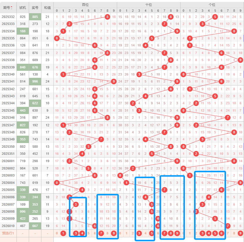 百位:百位开号上期开出了6号球,往前一期开的是2号球,上期的振幅为4,振幅变大,本期看好小振幅,其次防振幅变大;从012路走势来看,上期开了0路号码,本期看好1路,其次是0路;从开号位置来看,本期比较看左边的号码;