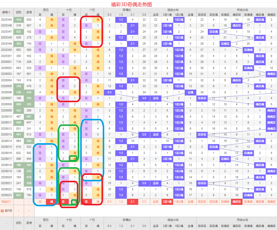 上期奇偶比是1:2,两偶的号码组合方式,从近五期的奇偶数出现情况看,奇数出现7次,偶数出现8次,奇数偶数号码出现较平均,本期侧重两奇的号码组合,侧重偶奇奇或偶奇偶的号码组合方式,根据奇偶形态做五码定位02468/13579/13579或02468/13579/02468