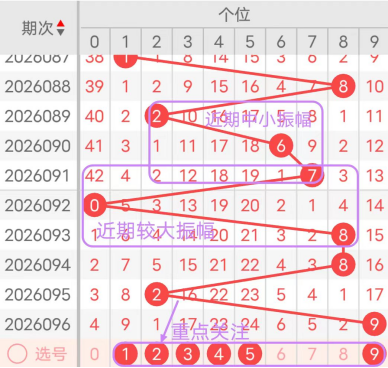 7期(090~096)开奖号个位号码球分别为6、7、0、8、8、2、9,开奖号与上一期走出的振幅分别为4、1、7、8、0、6、7。090期走出6号中大数号码球,走出“4”的中小幅度,091期走出7号大数号码球,走出“1”的小幅度,092期走出0号小数号码球,走出“7”的大幅度,093期走出8号大数号码球,走出“8”的大幅度,094期走出8号大数号码球,走出“0”的小幅度,095期走出2号小数号码球,走出“6”的中大幅度,096期走出9号大数号码球,走出“7”的大幅度;从近期振幅大小的走势及大小走势来看,中大振幅走在5~8之间较为适宜,中小振幅走在0~4之间较为适宜;结合走势图的整体及大小走势分析,本期个位应重点关注号码球为1、2、3、4、5、9