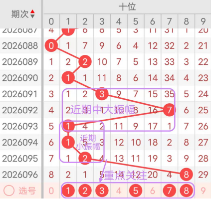7期(090~096)开奖号十位号码球分别为1、3、7、1、1、2、8,开奖号与上一期走出的振幅分别为1、2、4、6、0、1、6。090期走出1号小数号码球,走出“1”的小幅度,091期走出3号中小数号码球,走出“2”的小幅度,092期走出7号大数号码球,走出“4”的中小幅度,093期走出1号小数号码球,走出“6”的中大幅度,094期走出1号小数号码球,走出“0”的小幅度,095期走出2号小数号码球,走出“1”的小幅度,096期走出8号大数号码球,走出“6”的中大幅度;从振幅大小及走势图的整体对应来看,中大振幅走在5~7之间较为适宜,中小振幅走在0~3之间较为适宜;结合走势图的上下对应及振幅大小分析,本期十位应重点关注号码球为1、2、3、5、7、8