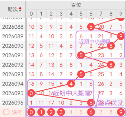 7期(090~096)开奖号百位号码球分别为8、5、8、5、4、0、6,开奖号与上一期走出的振幅分别为1、3、3、3、1、4、6。090期走出8号大数号码球,走出“1”的小幅度,091期走出5号中大数号码球,走出“3”的中小幅度,092期走出8号大数号码球,走出“3”的中小幅度,093期走出5号中大数号码球,走出“3”的中小幅度,094期走出4号中小数号码球,走出“1”的小幅度,095期走出0号小数号码球,走出“4”的中小幅度,096期走出6号中大数号码球,走出“6”的中大幅度;从振幅大小及走势图的整体形势,中大幅度走在4~6之间较为适宜,中小幅度走在0~3之间较为适宜;结合走势图的整体及大小走势分析,本期百位需重点关注号码球为0、1、2、3、6、9