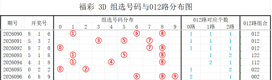7期(090~096)开奖号与012路组合分别为816(012)、537(012)、870(012)、518(122)、418(112)、022(022)、689(002)上期开奖号为002路组合,根据整体走势分析,本期看好的012路组合有:012、002、001,011、022、112组合。