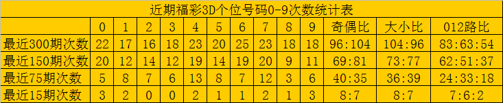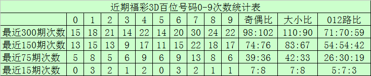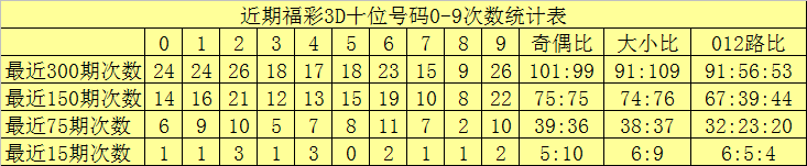最近15期奖号由冷到热表现为:0、5→0次,3、8、9→1次,2、4、7→2次,1、6→3次,奖号奇偶比为7:8,大小比为7:8,012路比为5:7:3。
