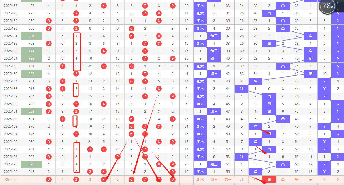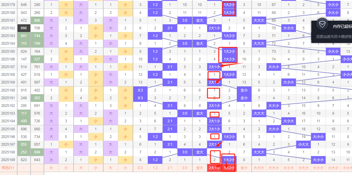 如图所示,上期开出一大2小走势,本期首先要考虑的就是两大一小的分边,遗漏1-2-1-1-2对等形态复制,然后防守1大两小走重,故本期给的推测是二大一小,防一大二小的遗漏4期对等遗漏回补,个位大码:56789,十位小码:01234,百位大码:56789,接下来推测本期奇偶比