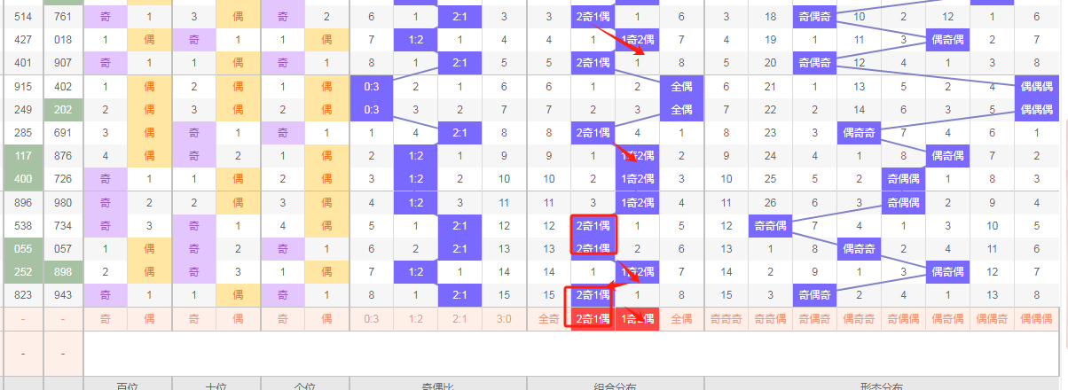 如图所示,上期开出2奇一偶,个位为奇,开一期,十位为偶开一期,百位为奇开一期,比例2:1期,本期推测2奇1偶,防1奇2偶。个位为为奇13579,十位为偶02468,百位为奇13579,大小比,奇偶比我们已经研测完毕,下面研测本期码数: