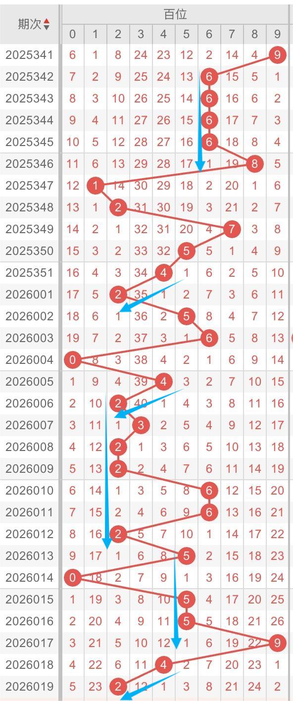 以近30期百位的走势形态分析:重复形态交替出现。例如:数字2/5/6重复开出。本期重点关注:数字5/6可能重开,同时关注数字2-7/2-8开出斜连形态。个人分析,仅供参考。