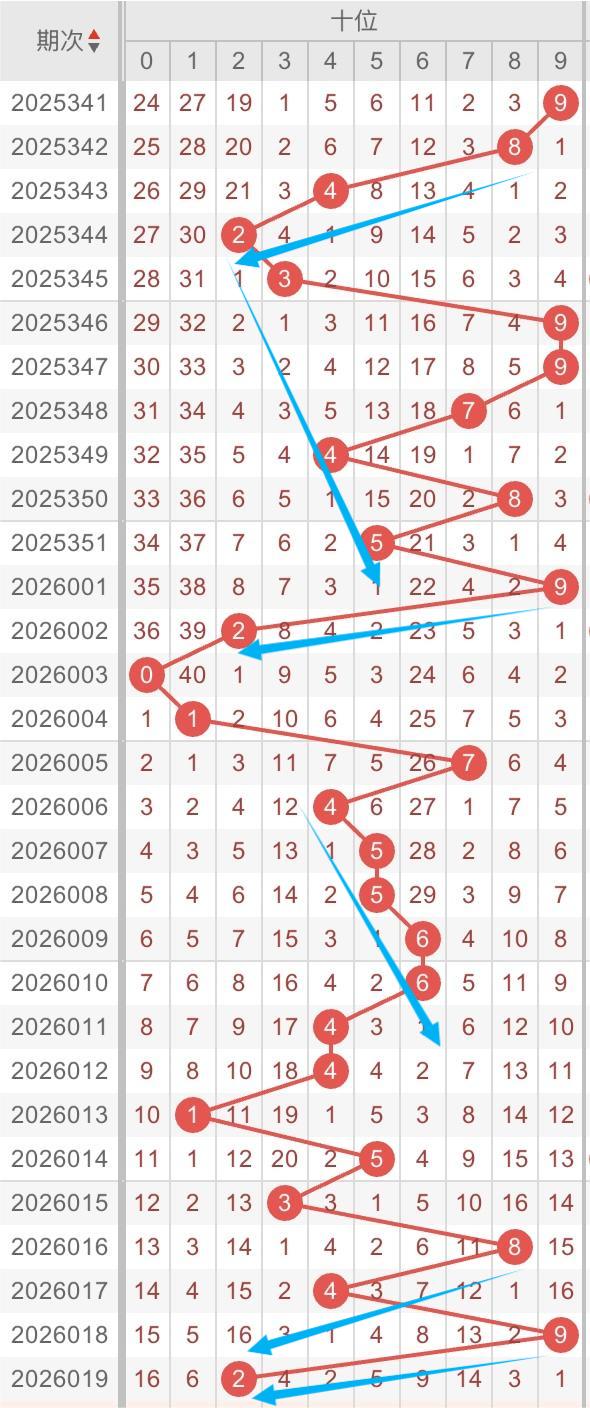 以近30期十位的走势形态分析:斜连形态多次出现。例如:数字2-3-4/4-5-6形态。本期重点关注:数字2-3-4斜连开出,同时关注2-9跨度开出。个人分析,仅供参考。