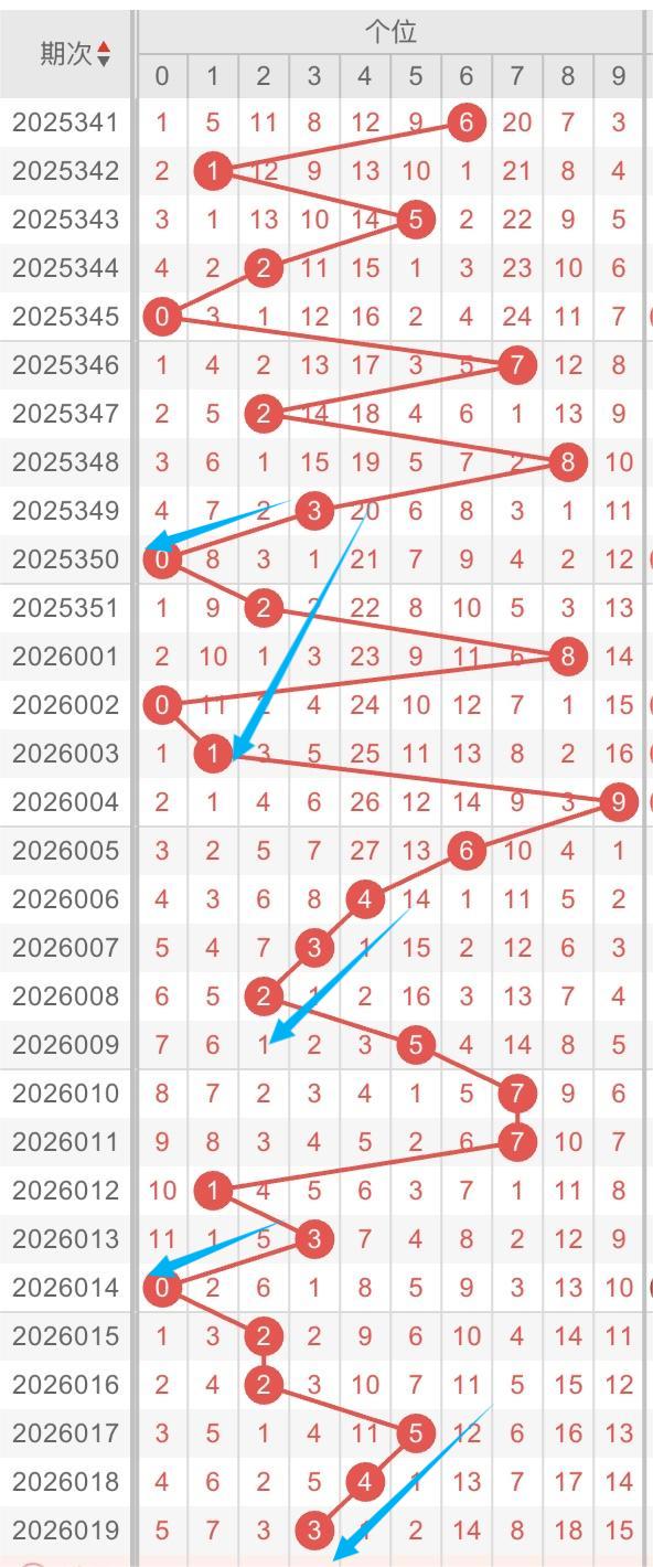 以近30期个位的走势形态分析:斜连交替出现。例如:数字2-3-4/3-4-5斜连开出。本期重点关注:数字数字2-3-4斜连开出,同时关注数字3-0/3-8跨度形态。个人分析,仅供参考。