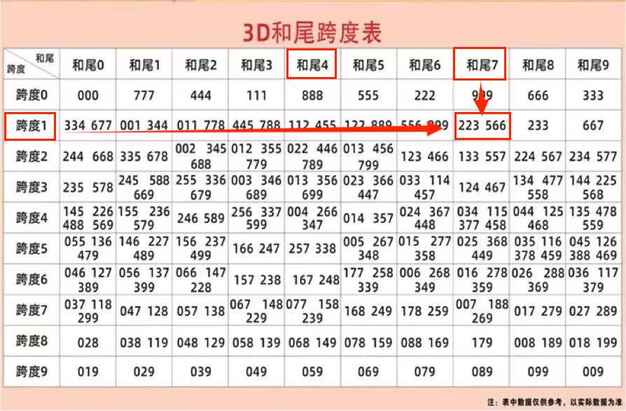 最后分享一个实用的3D和尾值与跨度值组合统计表。组合号码时,根据推测的和尾值结合跨度值,查找统计表上推荐的组合号码。以26019期为例:和值尾7、跨度值1,在统计表上查找的组合号码有:223/566,其中组合号码223中出(开奖号码223)。特别注意:统计表上推荐的组合号码,不是直选号码,不定位百十个位的顺序。仅供参考。