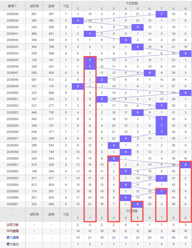 上期个位:5,近10期个位出号:3 4 3 9 4 7 4 7 4 5。最近10期大小变化分别:小小小大小大小大小大,奇偶变化分别:奇偶奇奇偶奇偶奇偶奇,质合变化分别:质合质合合质合质合质,根据近10期规律本期综上所述个位出号推荐5个号码:1 3 5 7 9。