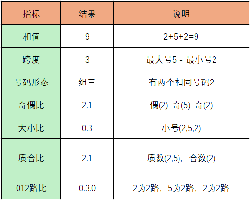 重号分析:近30期有24期出现了至少1个与上期相同的号码(重号),出现频率为 80.0%。上期号码2、5、2中,号码2作为对子码,是超级热号(30期内出现12次)。高频率继续支持重号出现。本期可重点关注热号 2,其次关注 5