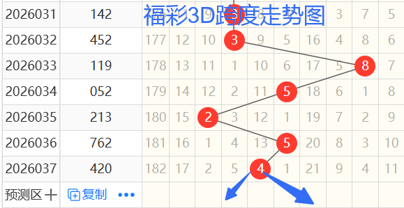 2)我们来看跨度;还是以033期——037期为例,如图依次是85254跨度,按照路数转换关系来看,那么跨度我们暂定369258跨 ,本期个人比较看好3 6跨。