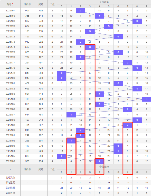 上期个位:4,近10期个位出号:1 8 7 2 2 1 6 6 0 4。最近10期大小变化分别:小大大小小小大大小小,奇偶变化分别:奇偶奇偶偶奇偶偶偶偶,质合变化分别:质合质质质质合合合合,根据近10期规律本期综上所述个位出号推荐5个号码:1 2 3 4 7。