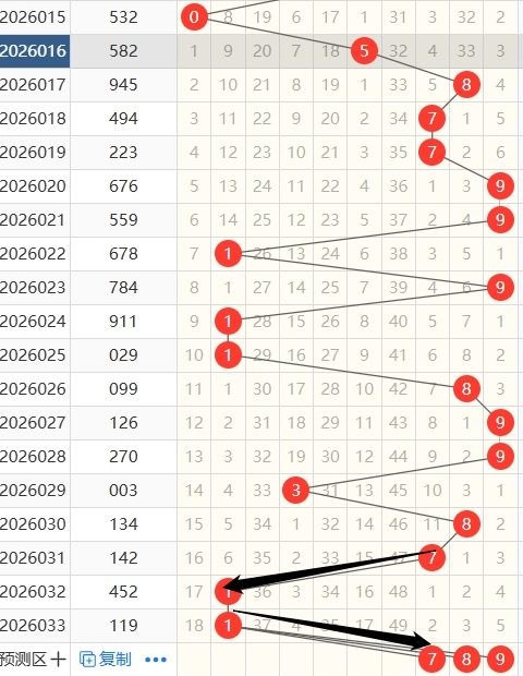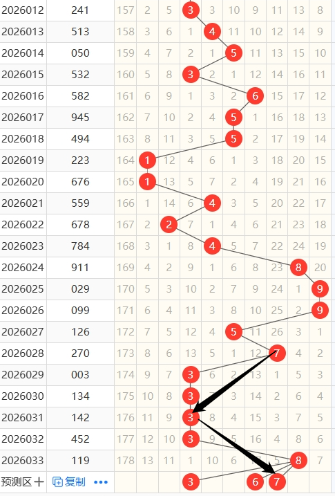 上期跨度为8,近5期跨度开出情况:第26028期开出7,属于奇数,1路号码,火属性;第26030期开出3,属于奇数,0路号码,木属性;第26031期开出3,属于奇数,0路号码,木属性;第26032期开出3,属于奇数,0路号码,木属性;第26033期开出8,属于偶数,2路号码,木属性;