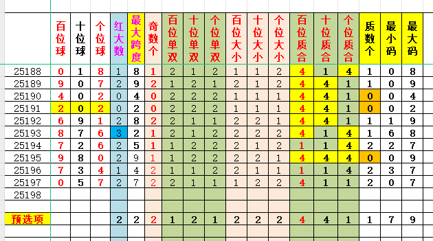 通过上面对百、十、个位的各项特征分析可知,本期福彩3D的最优号码结构为:9+(6/8)+(5/7),即有四个直选号码: