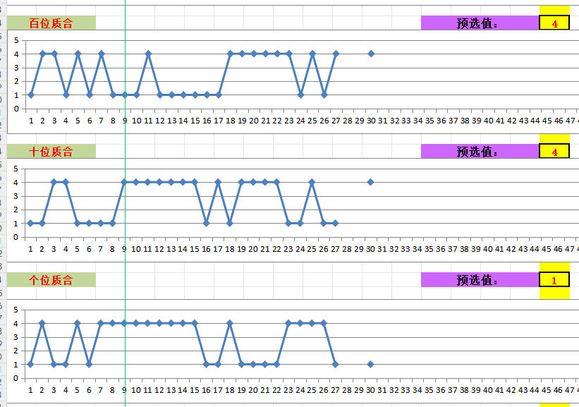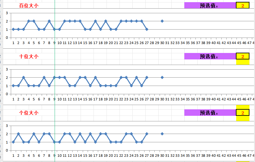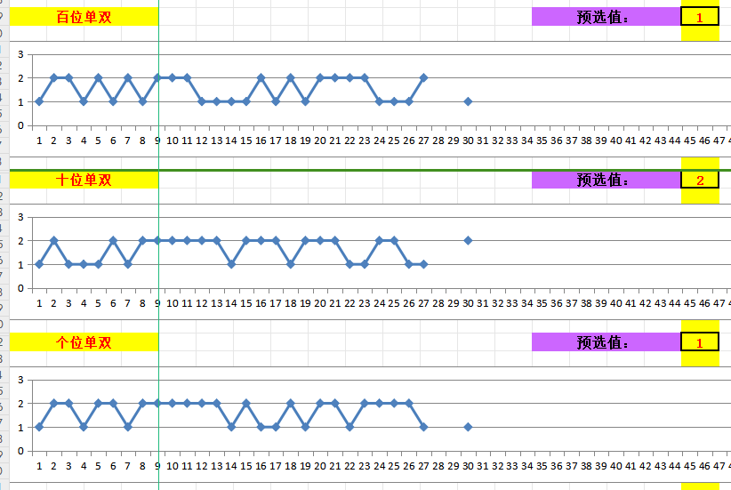 二、结合上面的数据及3D各项指标,对百、十、个位的大小+单双+质合数进行分析如下,先看大小、单双、质合数三张图表:
