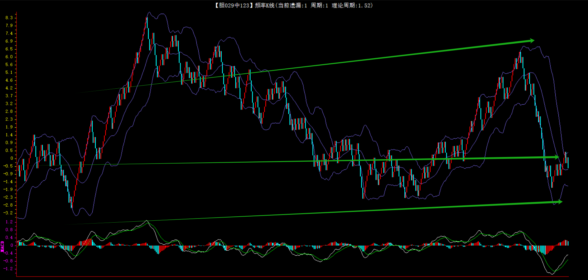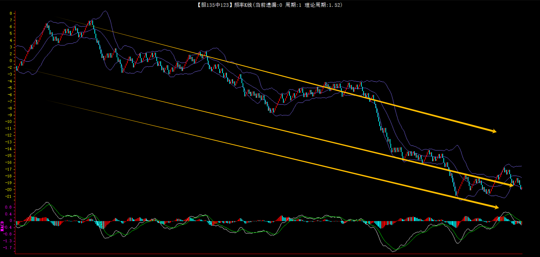 整体趋势下行,上边沿线趋势向下,下边沿趋势也是向下,节点震荡,当前开1期,本期防守。