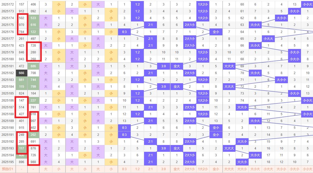 大小走势分析 在195期中开奖号980,大小比为2:1,大数占据优势。回顾历史数据,发现大小比常常在短期内呈现波动,但长期趋于平衡。因此,在196期中,大小比将继续调整,倾向于保持大数优势。基于这一逻辑,预判196期的大小走势可能为“大小中”或“大中小,这样的组合不仅符合历史波动规律,也体现了当前大小比调整的趋势。
