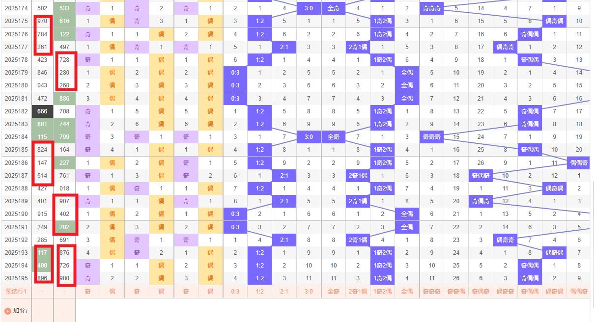 奇偶比例分析 195期的奇偶比为1:2,偶数占据主导地位。在奇偶比例的分析中,同样注重平衡原则。考虑到近期奇偶比的波动,可以预判196期的奇偶比例将继续保持平衡,即可能为2:1或1:2。这样的预判不仅符合历史数据的统计规律,也体现了奇偶比例在短期内的调整趋势。