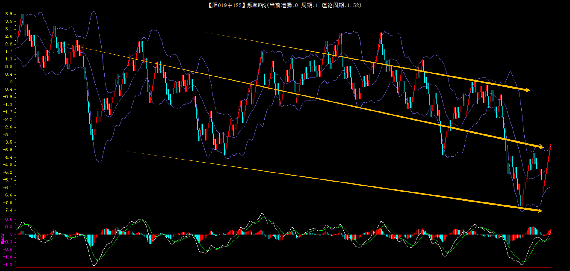 整体趋势下行,上边沿线趋势向下,下边沿趋势也是向下,节点震荡,当前开1期,本期防守。