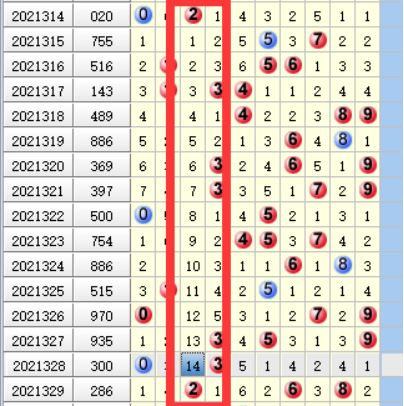 我们可以看到这个数字2,近期数字2非常冷,一直冷到14期后才开出数字2,那么我们回到2021328期开出号码300,一个全小数字的组三对子号码,这样的号码一旦形成,我们脑子就要形成一个概念,这个时候数字2开出的概率是否大呢?两个思路来验证