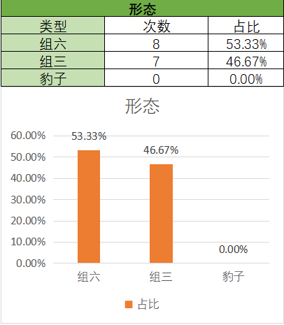 上期开的是组六,其中组六占比变多,组三占比变小。通过图示可以看到,组六在15期内开了8期,组三开了7期。本期关注组六,防组三。