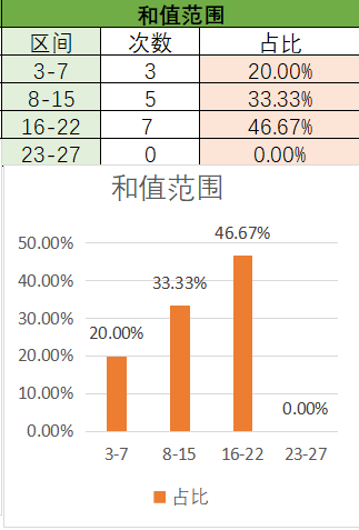 上期和值是21,处在16~22之间,其中16~22占比变大,8~15占比变小。目前是8~15,16~22占比最优,,最后是3~7。本期看好和值在8~15之间,其次是16~22。