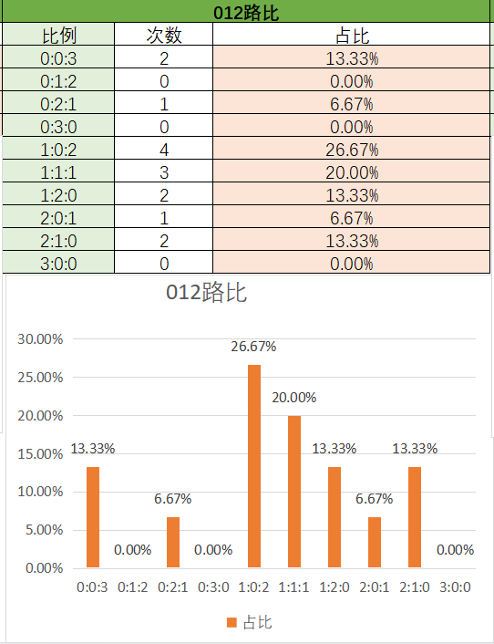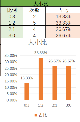 上期大小比为3:0,其中3:0占比变大,1:2占比变小。可以看到近15期内1:2优势最好的,其次是2:1,3:0,最后是0:3。本期看好2:1开出,其次是1:2。