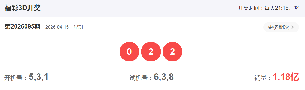 福彩3D2026年4月15日第095期开奖号码是022,和值4,跨度2,组三形态,偶偶偶,小小小