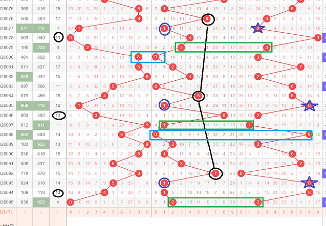 这是一张大盘走势分析图,全局分析,上期没有和大家分析走势,主要是没有看下太好的走势,这张走势图是一个朋友看下的,我们发现在十位开出了黑颜色6,间隔七期又开出了黑颜色5,再间隔七期开出了黑颜色7,形成了黑颜色675的顺子等距,在黑颜色6的下期开出了蓝颜色1,在黑颜色5的下期也开出了蓝颜色1,在黑颜色7的下期同样开出了蓝颜色1,在黑颜色6的下下期开出了049,049这三个数字相加等于13,在黑颜色5的下下期开出了382,382这三个数字相加也等于13,在黑颜色7的下下期开出了418,418这三个数字相加等于13,也就是说三个13和值对称,继续往下分析,第一次13和值的下期开出了33的组三对子,在第二个13和值的下期开出了11的组三对子,那么轮到昨天,就应该考虑22的组三对子,形成了33,22,11的全小对子,继续往下分析,33的对子下期开出了802,全偶形态,在11的对子下期开出608,也是全偶形态,那么轮到今天,会不会开出全偶形态,第一次有08组合,第二次也有08组合,那么今天会不会开出08组合,文字表达可能不太清楚,大家可以观看上面视频