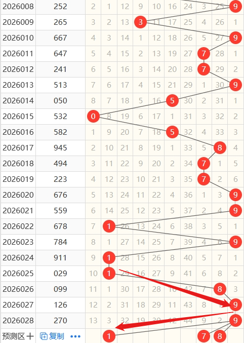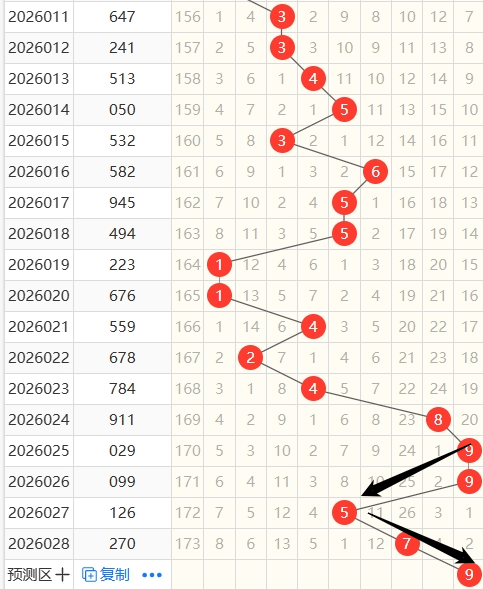 上期跨度为7,近5期跨度开出情况:第26024期开出8,属于偶数,2路号码,木属性;第26025期开出9,属于奇数,0路号码,金属性;第26026期开出9,属于奇数,0路号码,金属性;第26027期开出5,属于奇数,2路号码,土属性;第26028期开出7,属于奇数,1路号码,火属性;