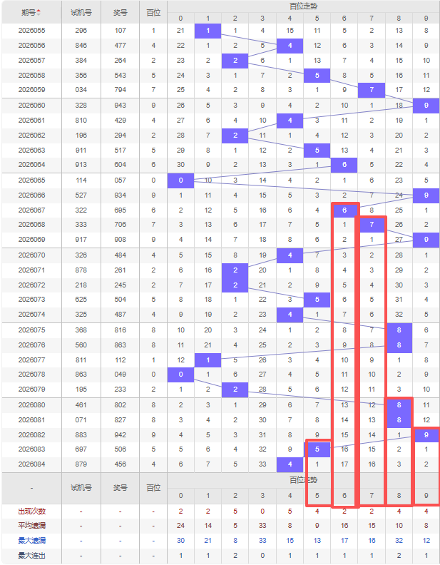 上期百位:4,近10期百位出号:8 8 1 0 2 8 8 9 5 4。最近10期大小变化分别:大大小小小大大大大小,奇偶变化分别:偶偶奇偶偶偶偶奇奇偶,质合变化分别:合合质合质合合合质合,根据近10期的出号规律本期综上所述百位出号推荐5个号码:5 6 7 8 9。