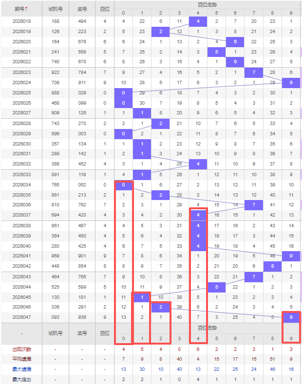 上期百位:2,近10期百位出号:4 4 4 9 8 7 5 1 2 9。最近10期大小变化分别:小小小大大大大小小大,奇偶变化分别:偶偶偶奇偶奇奇奇偶奇,质合变化分别:合合合合合质质质质合,根据近10期的出号规律本期综上所述百位出号推荐5个号码:0 1 2 4 9。