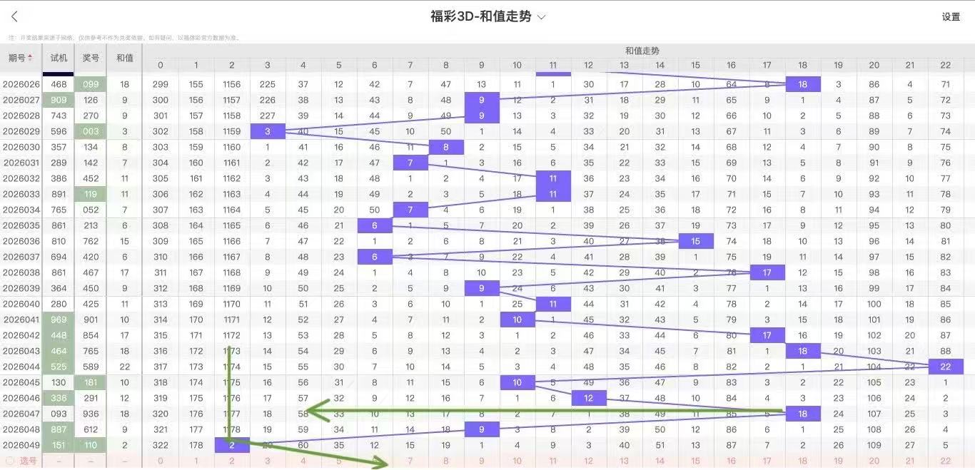 2026050期福彩3D和值走势图如下:上期开出和值2,和值在第1分区,而近百期开出和值2共1次,下期数据:- - - - - - 根据和值2的下期钟摆走势来看上升趋势稳定,近期和值喜在第2分区活动,和值形态规律:奇:大和尾形态奇:大,那么本期重点推荐值范围是:9-19主奇形态