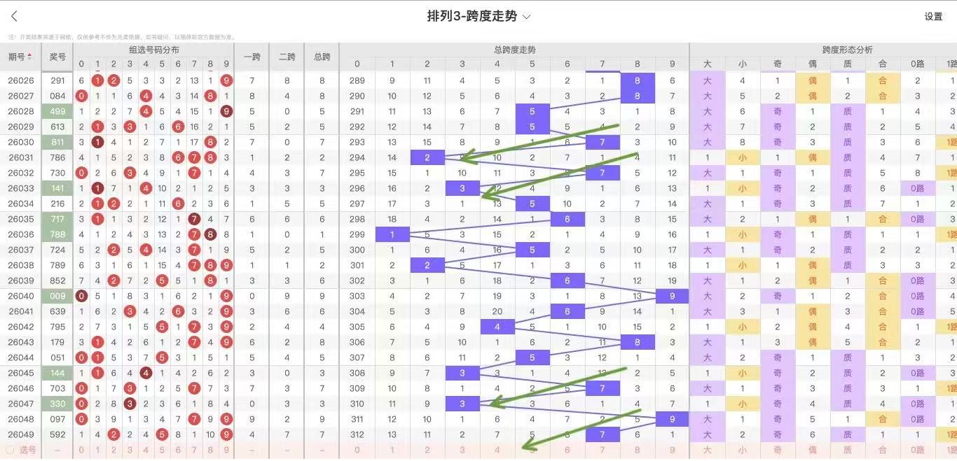 10期内跨度走势为:9-6-4-8-5-3-7-3-9-7,10期内大小跨比为7:3,奇偶跨比7:3,百期内跨度7共开出12次,下期数据:7 2 2 6 5 9 5 8 2 3 3 近期较热,考虑跨度7开出后容易出大跨度,近期大小规律下小:偶:合,所以接下来继续大跨,偶跨度表现!